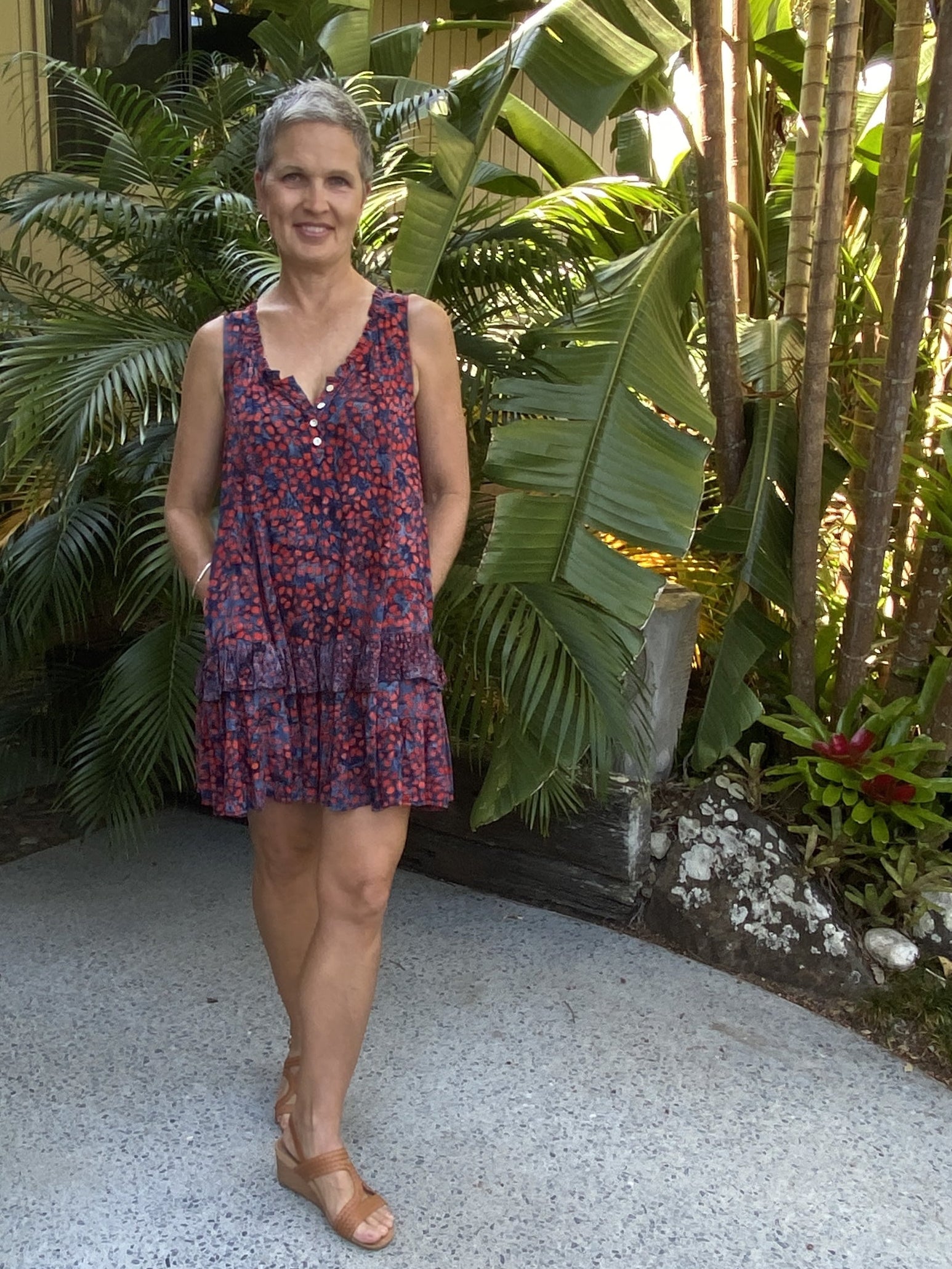 • Perfect little summer dress with pockets. Cool, sleeveless and flowing. Fabric buttons and contrast print feature.