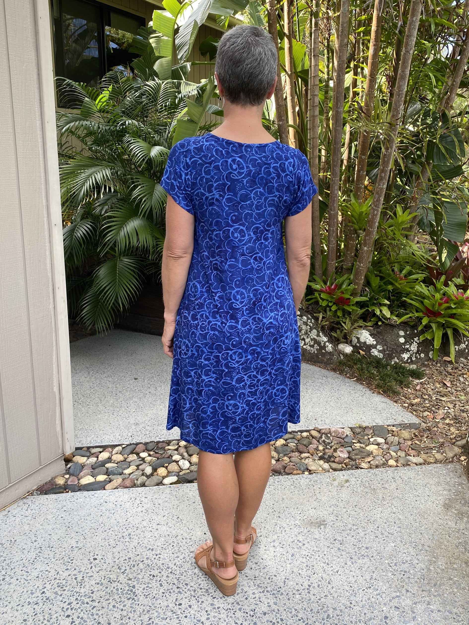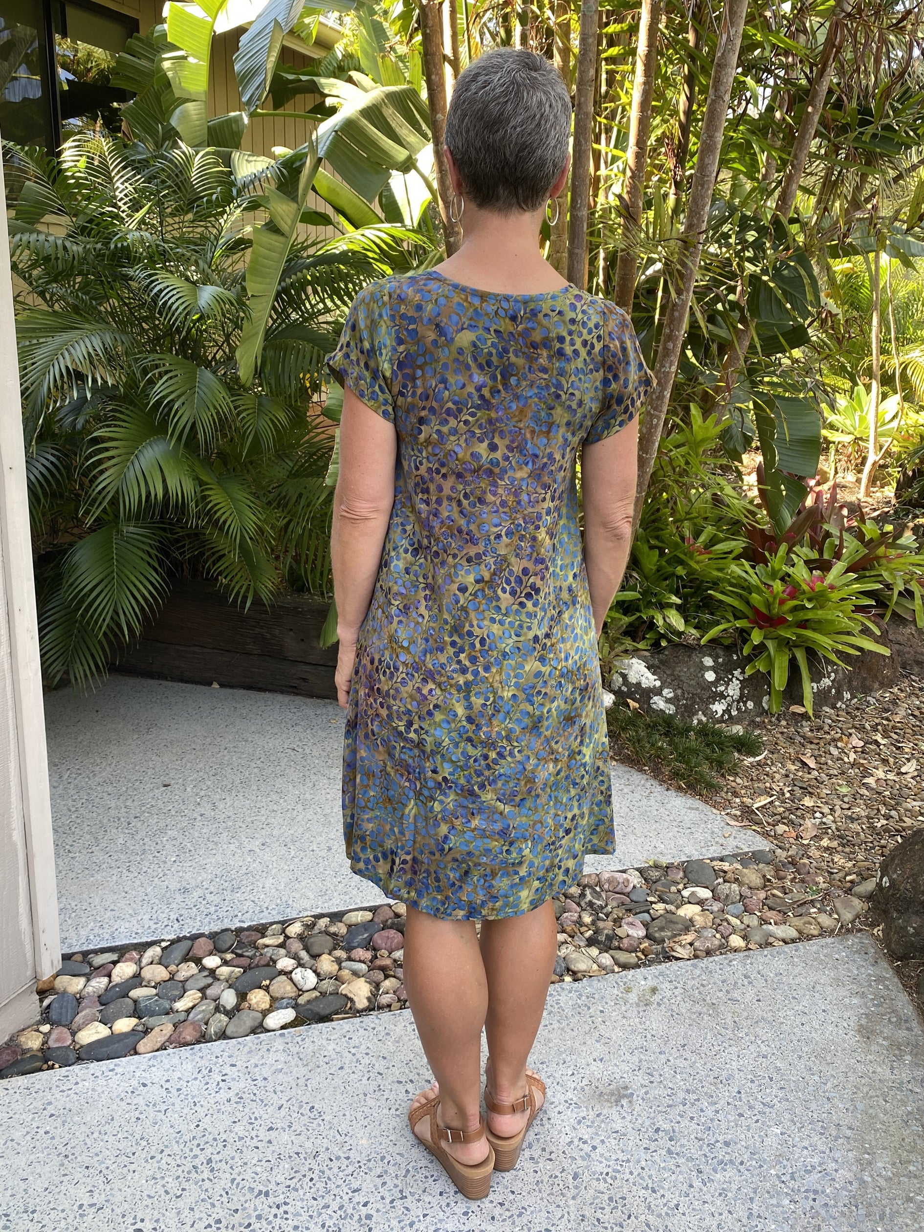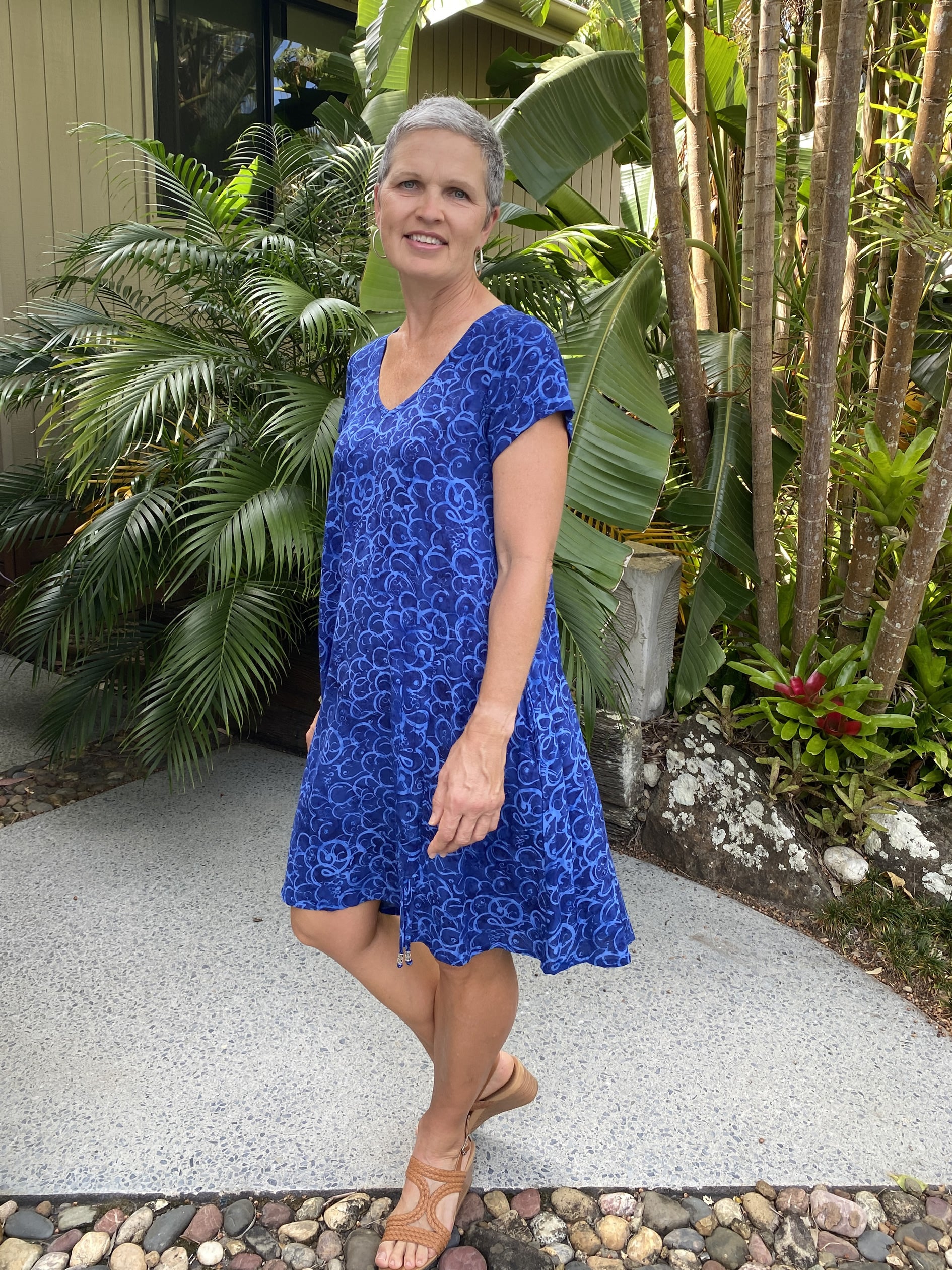 Cool, comfortable and elegant. Made from the softest, silkiest Rayon Voile. This loose fitting 'A' line dress has short sleeves, flattering V neck neckline with adjustable drawstring off set on the front with silver tone beads. Flowing flattering style. Dress it up for that special occasion. Made from my unique hand printed fabric.